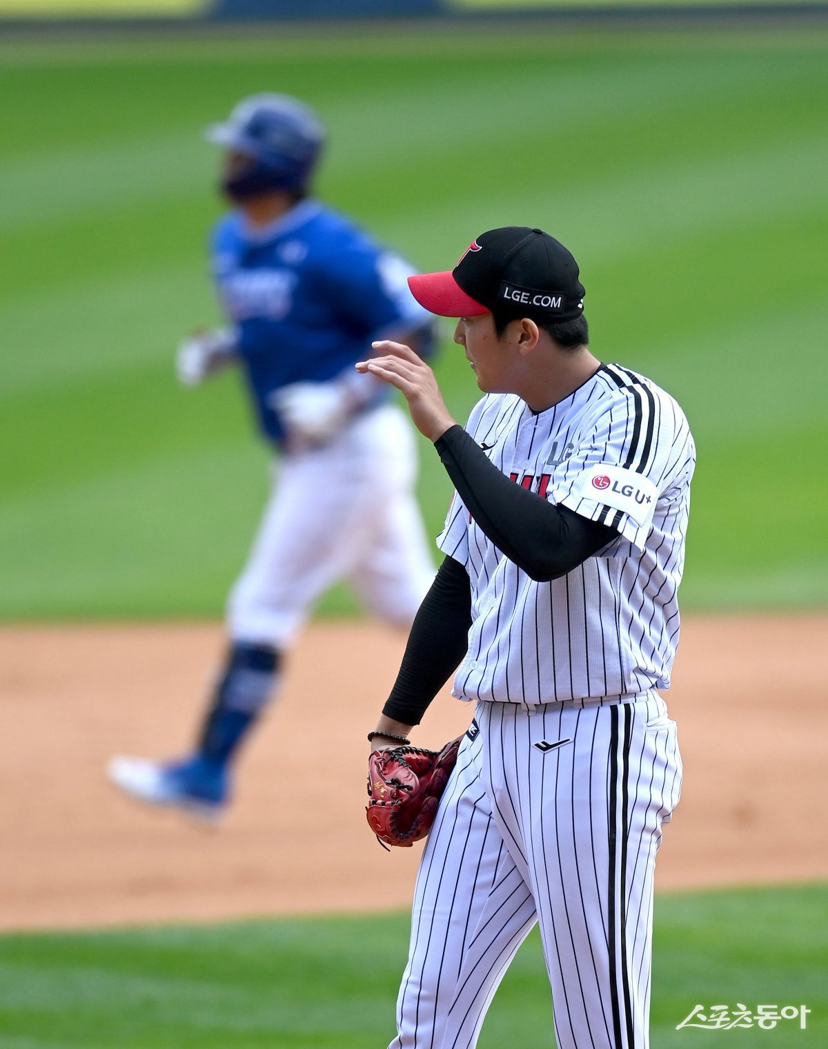 19일 서울 잠실야구장에서 ‘2024 신한은행 SOL뱅크 KBO리그’ 삼성 라이온즈와 LG 트윈스의 포스트시즌 플레이오프 4차전 경기가 열렸다. LG 손주영이 8회초 무사 삼성 강민호에게 좌중월 솔로 홈런을 허용하고 있다. 잠실|김종원 기자 won@donga.com