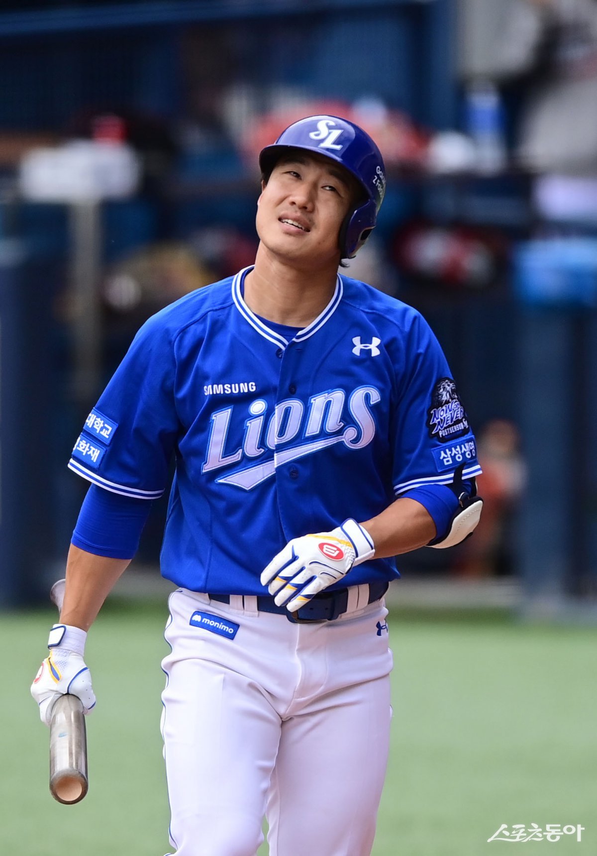 19일 서울 잠실야구장에서 열린 ‘2024 신한 SOL 뱅크 KBO리그’ 삼성 라이온즈와 LG 트윈스의 플레이오프 4차전 경기에서 4회초 1사 삼성 이성규가 삼진 아웃을 당한 후 아쉬워하고 있다.