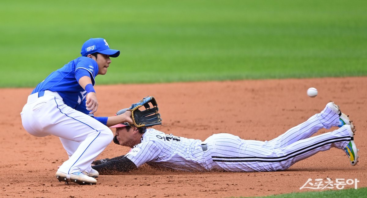 19일 서울 잠실야구장에서 열린 ‘2024 신한 SOL 뱅크 KBO리그’ 삼성 라이온즈와 LG 트윈스의 플레이오프 4차전 경기에서 2회말 1사 1루 상황에서 삼성 이재현이 도룰 시도한 LG 2루주자 오지환을 태그 아웃시키고 있다.