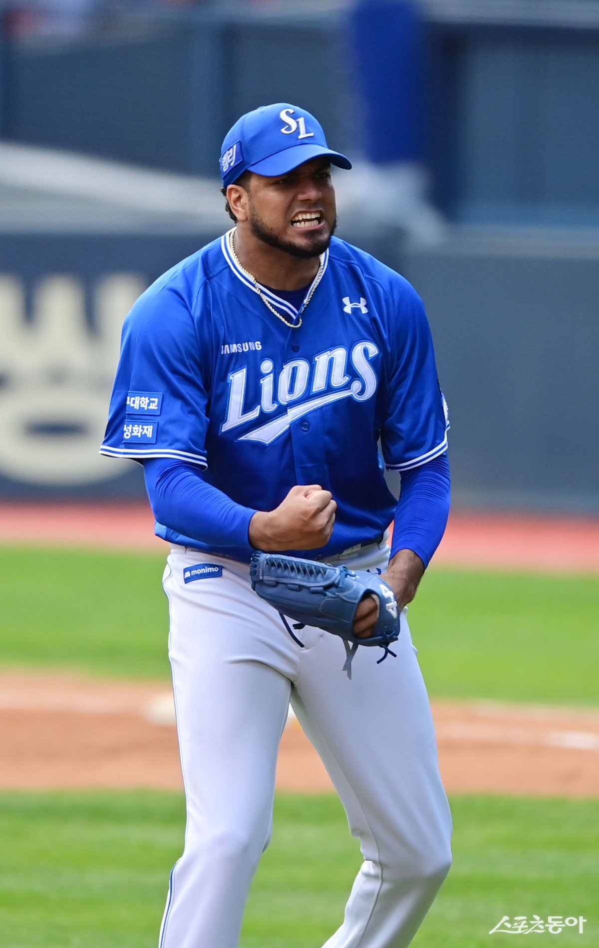 19일 서울 잠실야구장에서 열린 ‘2024 신한 SOL 뱅크 KBO리그’ 삼성 라이온즈와 LG 트윈스의 플레이오프 4차전 경기에서 6회말 LG에 병살타를 유도하며 무실점으로 수비를 마친 삼성 선발 투수 레예스가 포효하고 있다.