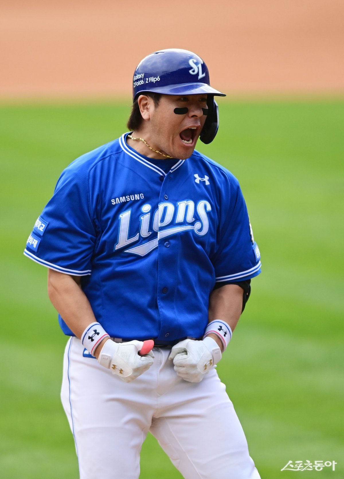19일 서울 잠실야구장에서 열린 ‘2024 신한 SOL 뱅크 KBO리그’ 삼성 라이온즈와 LG 트윈스의 플레이오프 4차전 경기에서 8회초 무사 삼성 강민호가 선제 좌월 솔로 홈런을 친 후 포효하고 있다.
