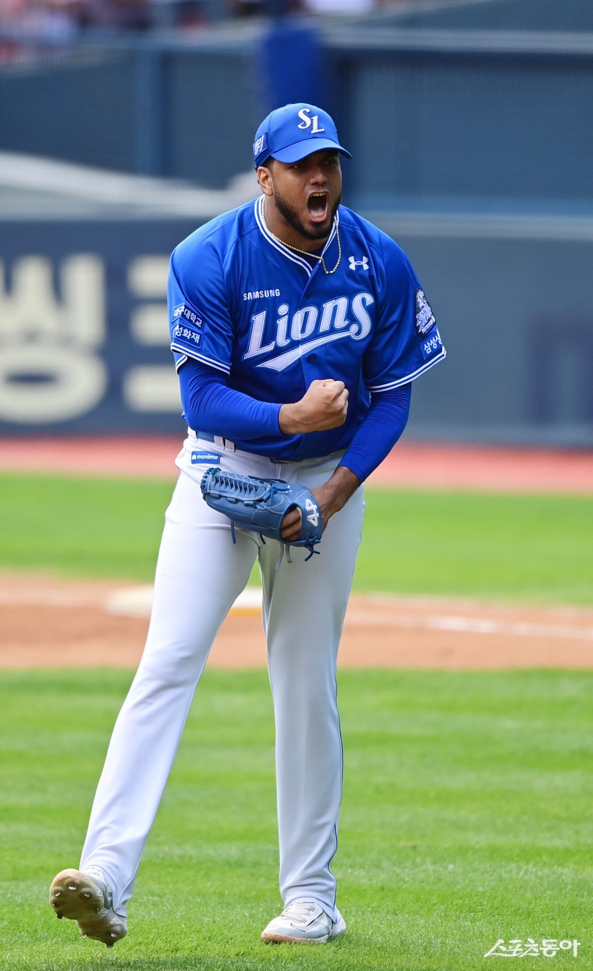 19일 서울 잠실야구장에서 열린 ‘2024 신한 SOL 뱅크 KBO리그’ 삼성 라이온즈와 LG 트윈스의 플레이오프 4차전 경기에서 6회말 LG에 병살타를 유도하며 무실점으로 수비를 마친 삼성 선발 투수 레예스가 포효하고 있다.