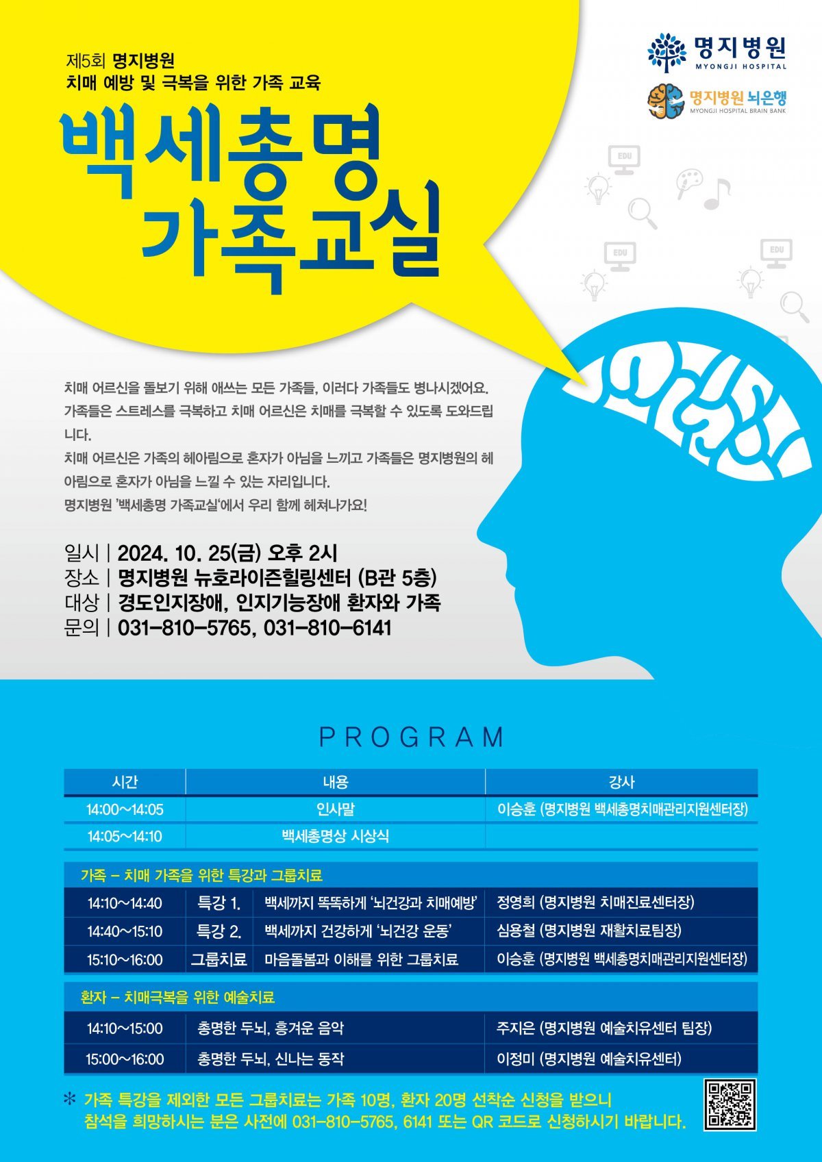 명지병원이 25일 오후 2시 뉴호라이즌힐링센터에서 ‘제5회 백세총명 가족교실’(사진)을 진행한다.