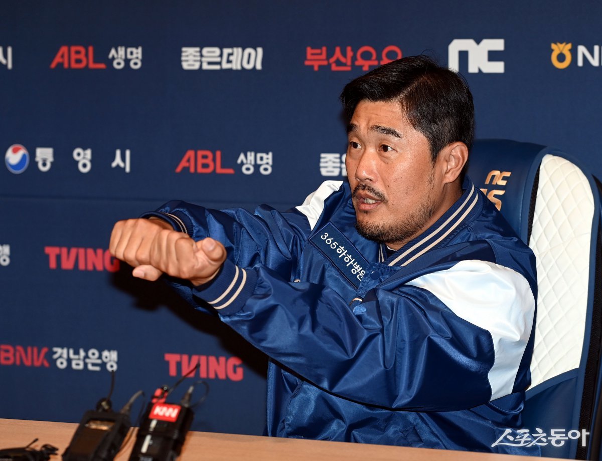 24일 창원NC파크에서 ‘NC 다이노스 이호준 신임감독’ 취임 기자회견이 열렸다. 이호준 감독이 소감을 밝히고 있다. 창원 | 김민성 기자 marineboy@donga.com