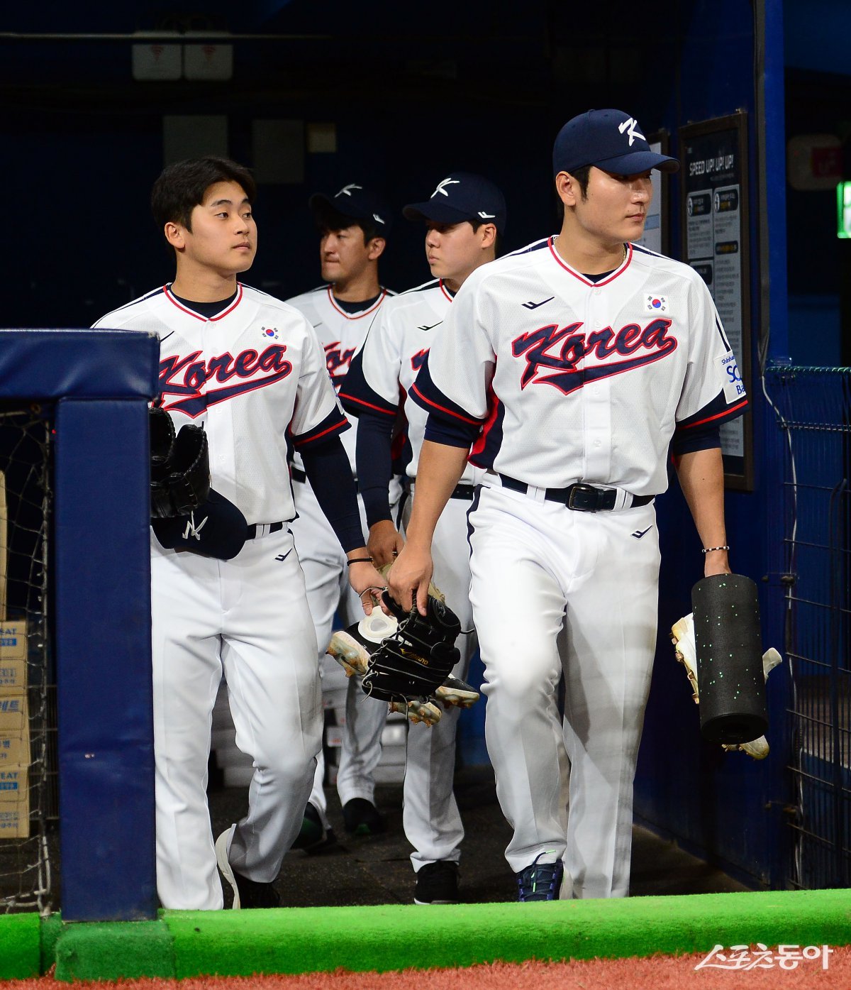 2024 세계야구소프트볼협회(WBSC) 프리미어12에 출전하는 한국 야구대표팀이 24일 서울 고척스카이돔에서 첫 훈련을 가졌다. 박영현과 곽빈이 그라운드로 나오고 있다. 고척|김종원 기자 won@donga.com