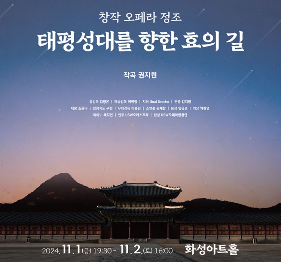 11월 1일과 2일, 조선 왕실의 역사적 순간을 담은 창작오페라 ‘정조, 태평성대를 향한 효의 길’이 화성아트홀에서 세계 초연된다. 조선의 개혁 군주, 정조의 감동적인 이야기…세계 초연