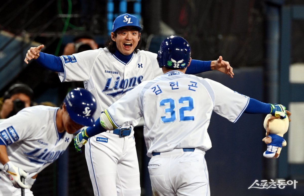 25일 대구 삼성라이온즈파크에서 ‘2024 신한 SOL 뱅크 KBO리그’ 삼성 라이온즈와 KIA 타이거즈의 한국시리즈 3차전 경기가 열렸다. 7회말 무사에서 삼성 김헌곤이 솔로 홈런을 쏘아 올린 후 구자욱의 환영을 받고 있다. 대구 | 김민성 기자 marineboy@donga.com