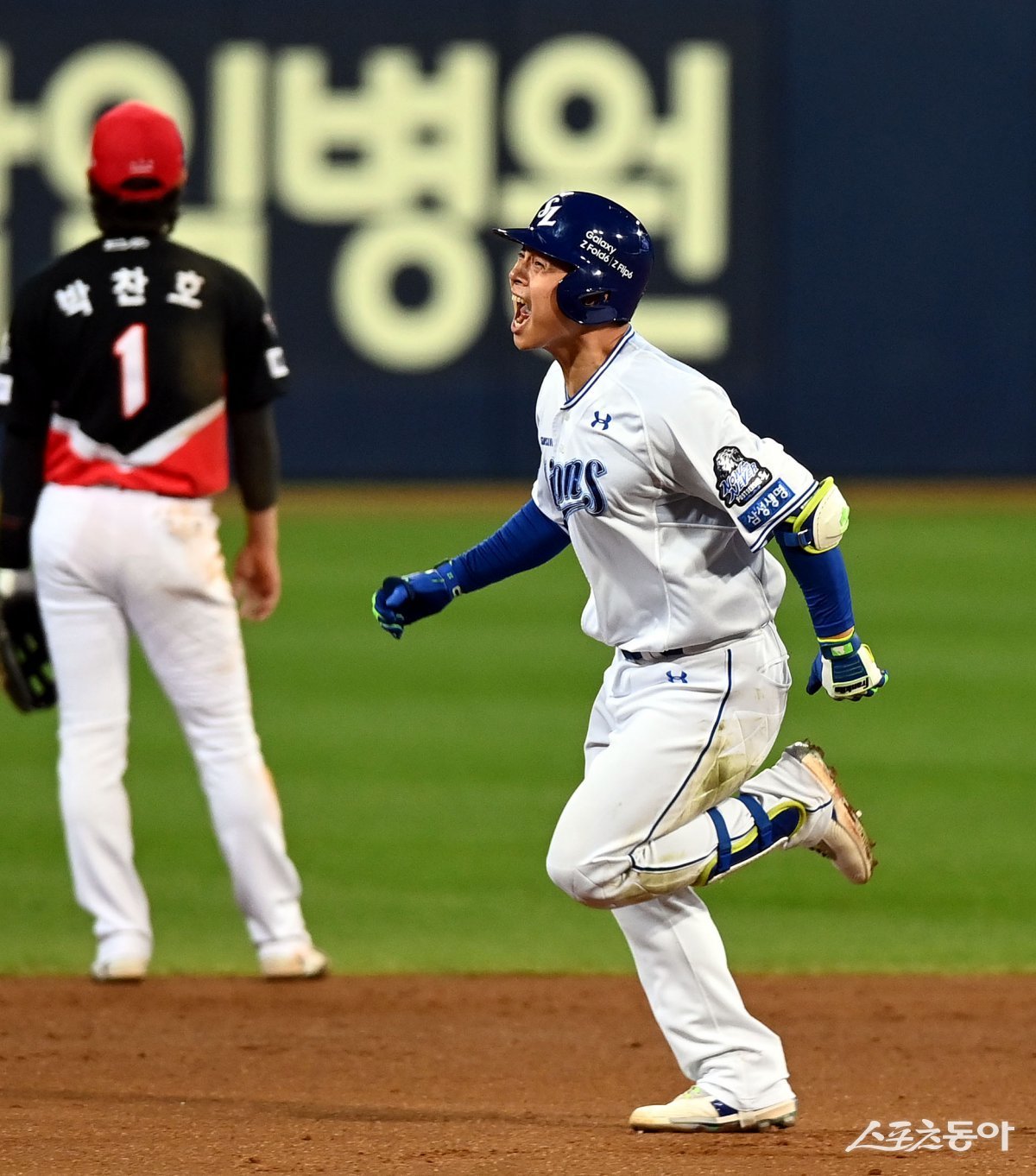 25일 대구 삼성라이온즈파크에서 ‘2024 신한 SOL 뱅크 KBO리그’ 삼성 라이온즈와 KIA 타이거즈의 한국시리즈 3차전 경기가 열렸다. 7회말 무사에서 삼성 김헌곤이 솔로 홈런을 쏘아 올린 후 환호하고 있다. 대구 | 김민성 기자 marineboy@donga.com