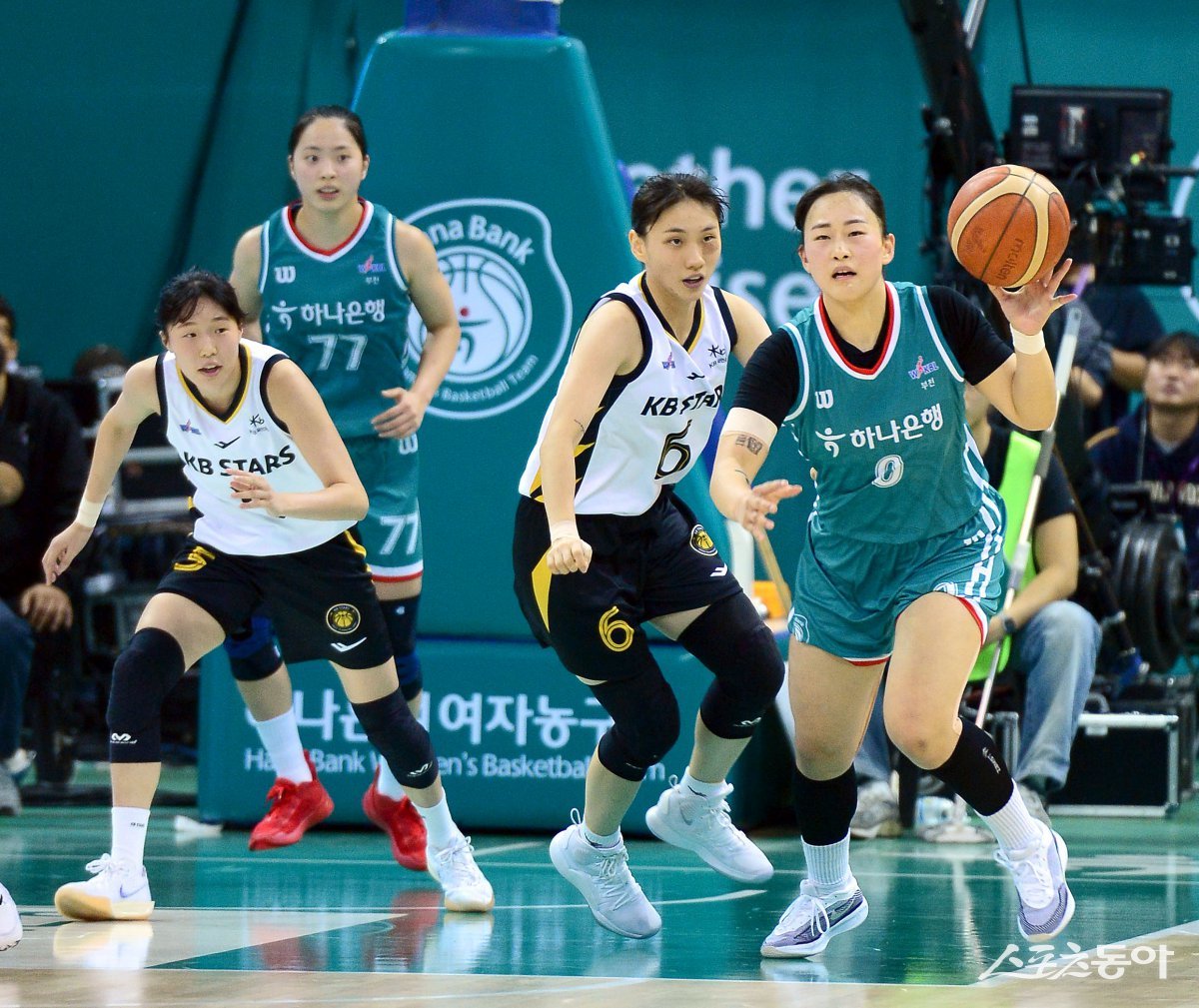 27일 부천체육관에서 열린 ‘하나은행 2024~25 여자프로농구’ 하나은행과 KB스타즈 경기에서 하나은행 엄서이가 속공을 펼치고 있다. 부천 | 김종원 기자 won@donga.com