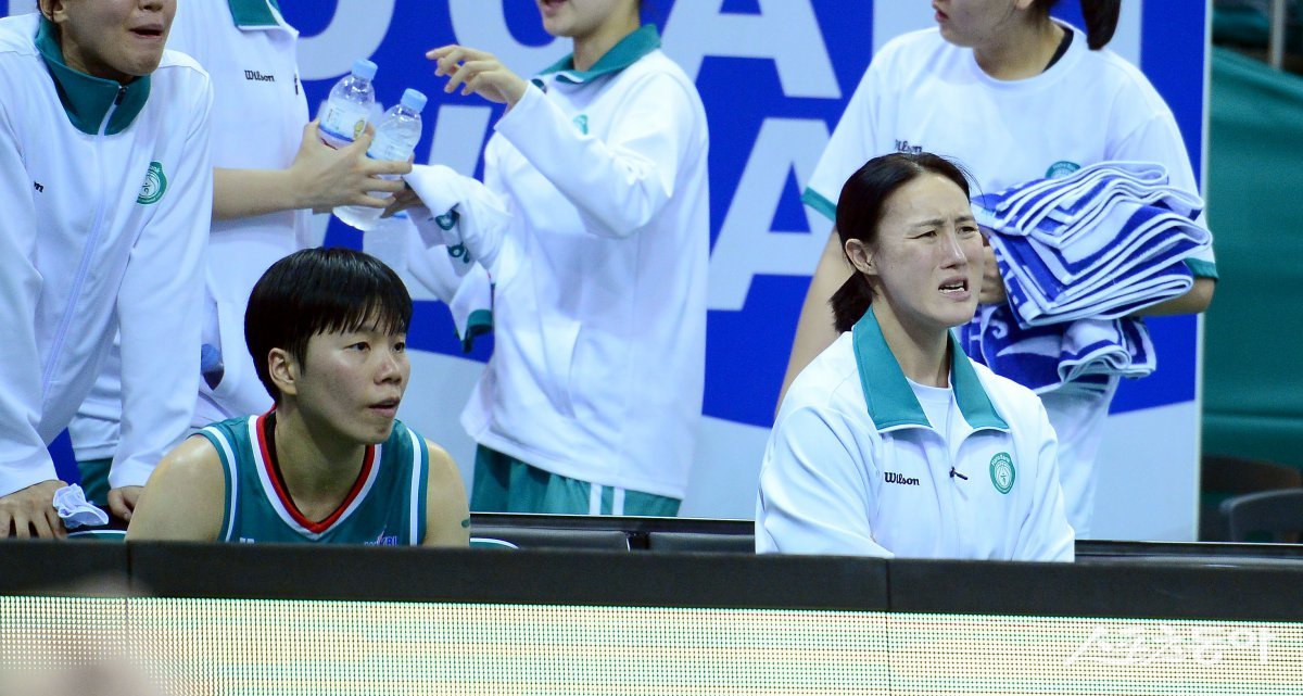27일 부천체육관에서 열린 ‘하나은행 2024~25 여자프로농구’ 하나은행과 KB스타즈 경기에서 부상으로 결장한 하나은행 김정은이 벤치에서 경기를 바라보고 있다. 부천 | 김종원 기자 won@donga.com