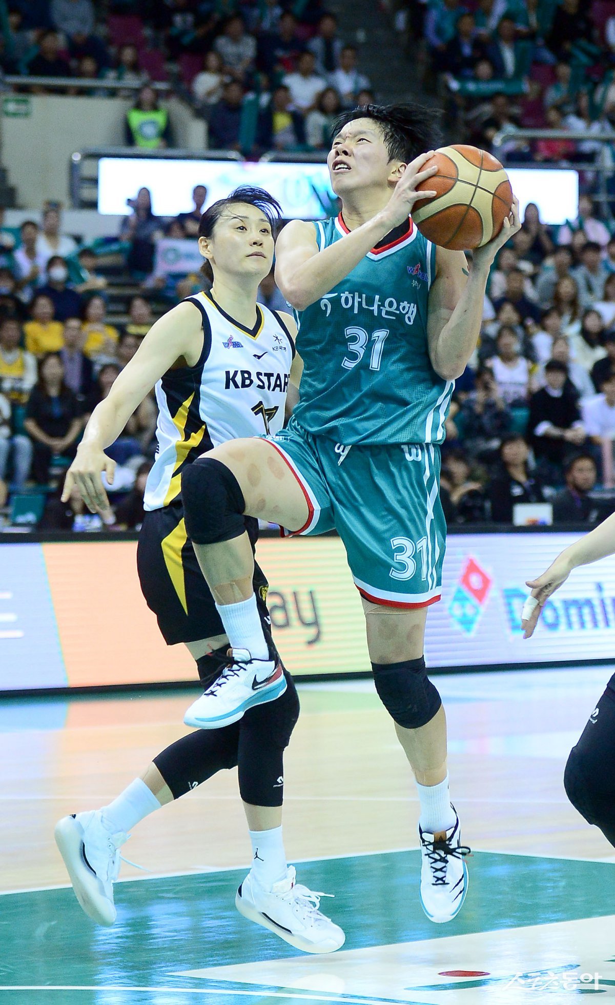 27일 부천체육관에서 열린 ‘하나은행 2024~25 여자프로농구’ 하나은행과 KB스타즈 경기에서 하나은행 진안이 KB스타즈의 수비를 뚫고 골밑을 공격하고 있다. 부천 | 김종원 기자 won@donga.com