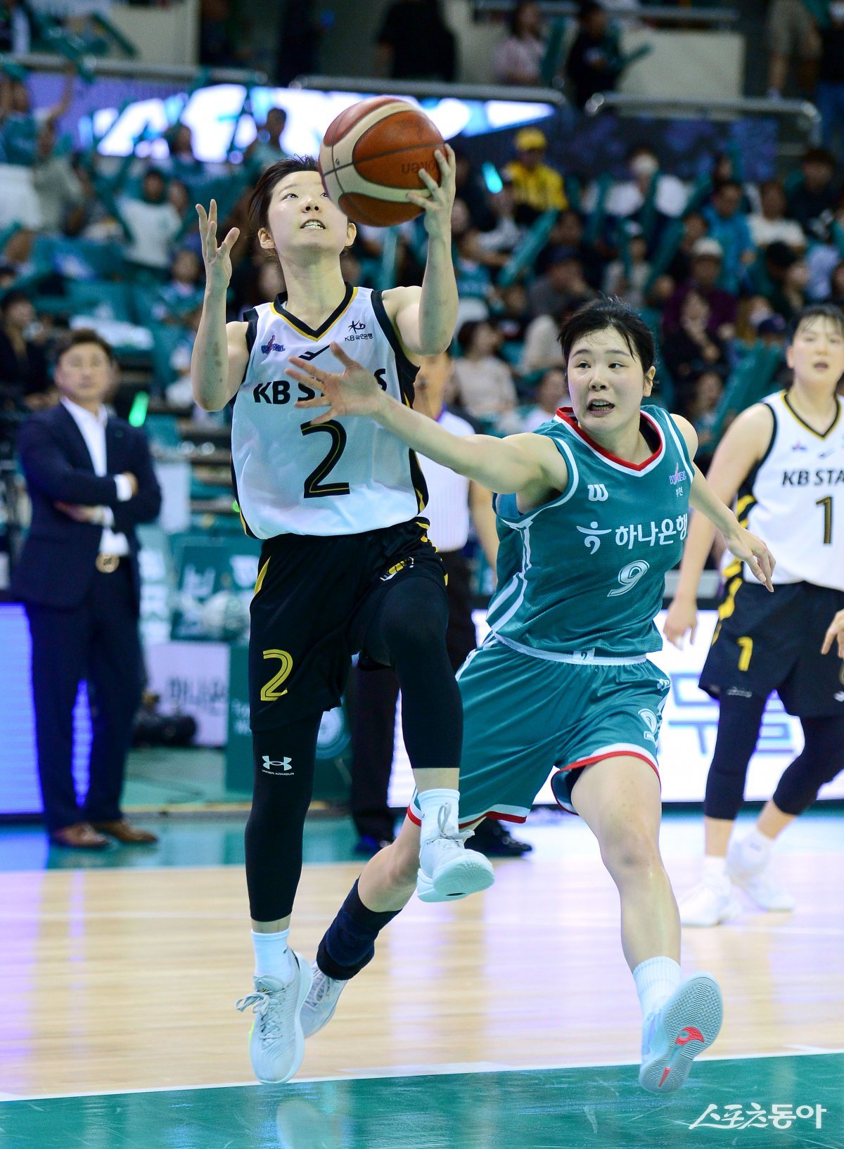 27일 부천체육관에서 열린 ‘하나은행 2024~25 여자프로농구’ 하나은행과 KB스타즈 경기에서 KB스타즈 허예은이 하나은행의 수비를 뚫고 골밑을 공격하고 있다. 부천 | 김종원 기자 won@donga.com