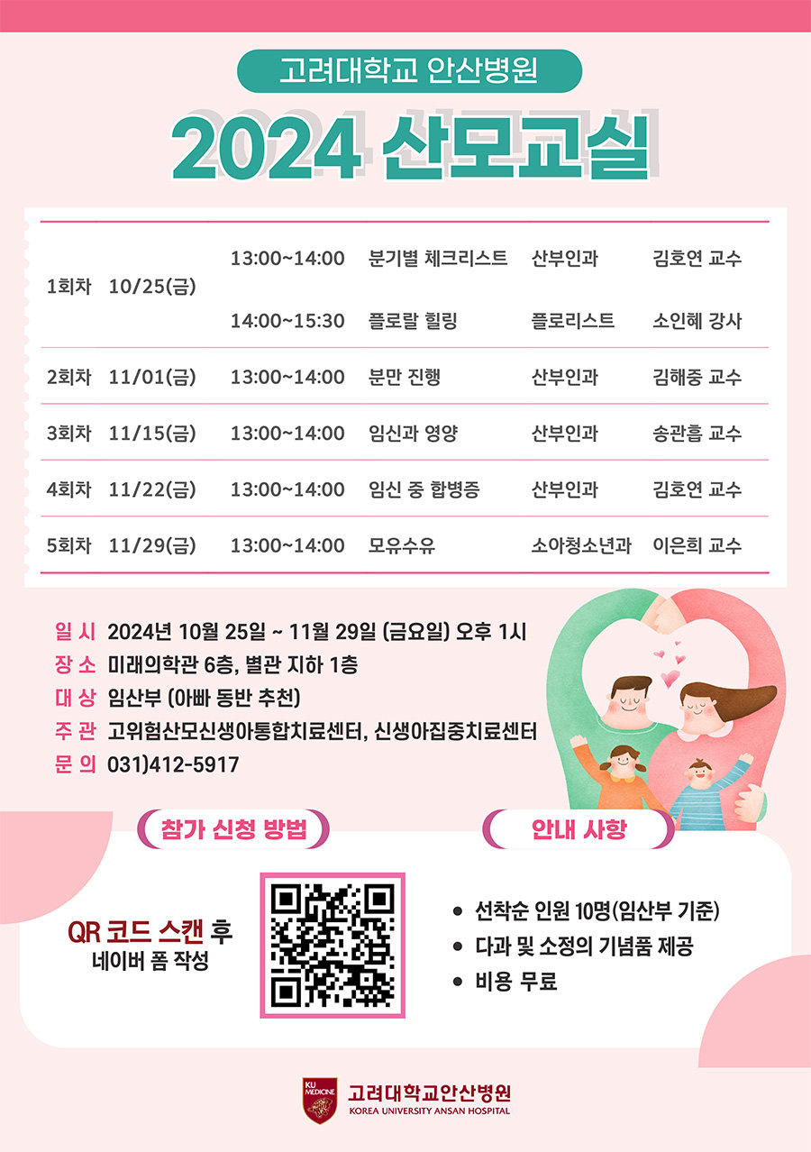 산모교실은 11월까지 네 차례 더 진행한다. 분만 진행(11월 1일, 전 고대안산병원 산부인과 김해중 교수), 임신과 영양(11월 15일, 산부인과 송관흡 교수), 임신 중 합병증(11월 22일, 산부인과 김호연 교수), 모유 수유(11월 29일, 소아청소년과 이은희 교수)를 주제로 실시한다. 온라인 접수(QR코드)를 통해 프로그램별로 선착순 10명이다.