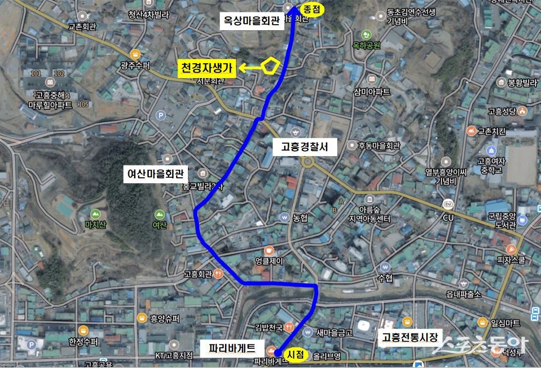 ‘천경자예술길’로 명예도로명이 부여되는 구간은 고흥읍 중심부의 봉황길과 옥상길을 거쳐 천 화백의 생가가 있는 옥상마을 일대까지 약 851m에 이른다. 특히, 생가와 인접한 이 구간은 천 화백의 삶과 예술적 배경을 재조명할 수 있는 상징적 장소로 의미가 크다.
