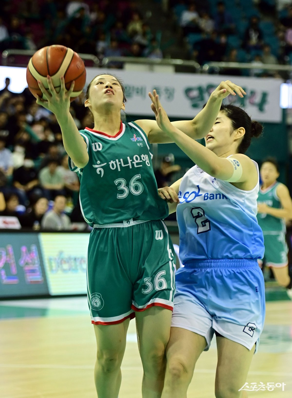 3일 경기 부천체육관에서 열린 ‘하나은행 2024-2025 여자프로농구’ 부천 하나은행과 인천 신한은행의 경기에서 하나은행 유즈키가 신한은행의 수비를 뚫고 슛을 하고 있다. 부천 | 주현희 기자 teth1147@donga.com