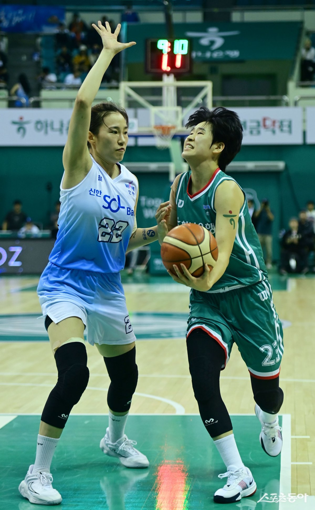 3일 경기 부천체육관에서 열린 ‘하나은행 2024-2025 여자프로농구’ 부천 하나은행과 인천 신한은행의 경기에서 하나은행 박진영이 신한은행 구슬 앞에서 슛을 하고 있다. 부천 | 주현희 기자 teth1147@donga.com