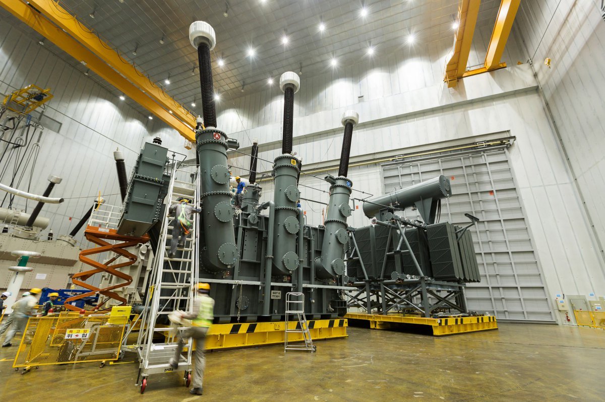 효성중공업이 전력기기 시장 호황으로 안정적 실적을 기록하며 순항 중이다. 자사 초고압변압기(위)와 이를 점검하고 있는 직원들. 사진제공|효성중공업