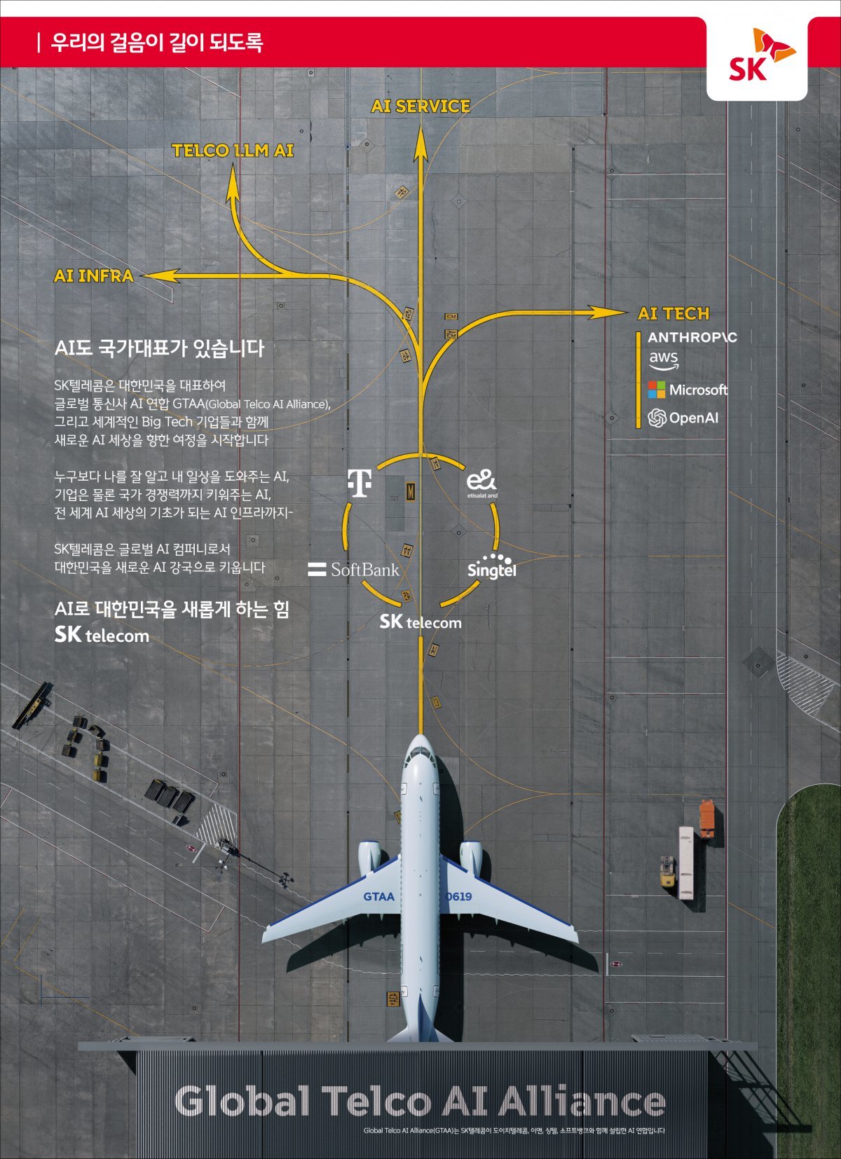 고민을 거듭하던 중 TVC의 배경이 되는 항공기에서 연결 고리를 찾게 됐고 글로벌 기업들과 협력해 새로운 AI 세상으로 나아가는 SK텔레콤의 여정을 출발선에 선 비행기의 모습으로 상징성 있게 표현하는 아이디어에 이르게 됐습니다. 뿐만 아니라 활주로의 비행 가이드라인을 활용해 자칫 복잡하게 들릴 수 있는 SK텔레콤의 AI 행보들을 딱딱하지 않게 전달할 수 있었고, 탑뷰의 앵글로 구성해 글로벌 기업들의 로고 또한 CI 규정에 위배되지 않게 녹일 수 있었습니다. 결론적으로 대중들에겐 다소 낯설고 어려울 수 있는 GTAA라는 주제를 활주로와 이륙 가이드라인이라는 소재를 이용해 새로운 비주얼로 풀어낸 크리에이티브가 좋은 결과를 만들어냈다고 생각합니다.