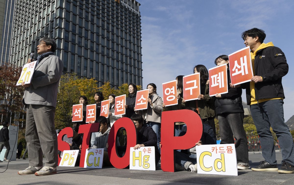 5일 서울 종로구 광화문 광장 이순신 동상 앞에서 열린 영풍 석포제련소 폐쇄 촉구 기자회견 모습. 뉴시스