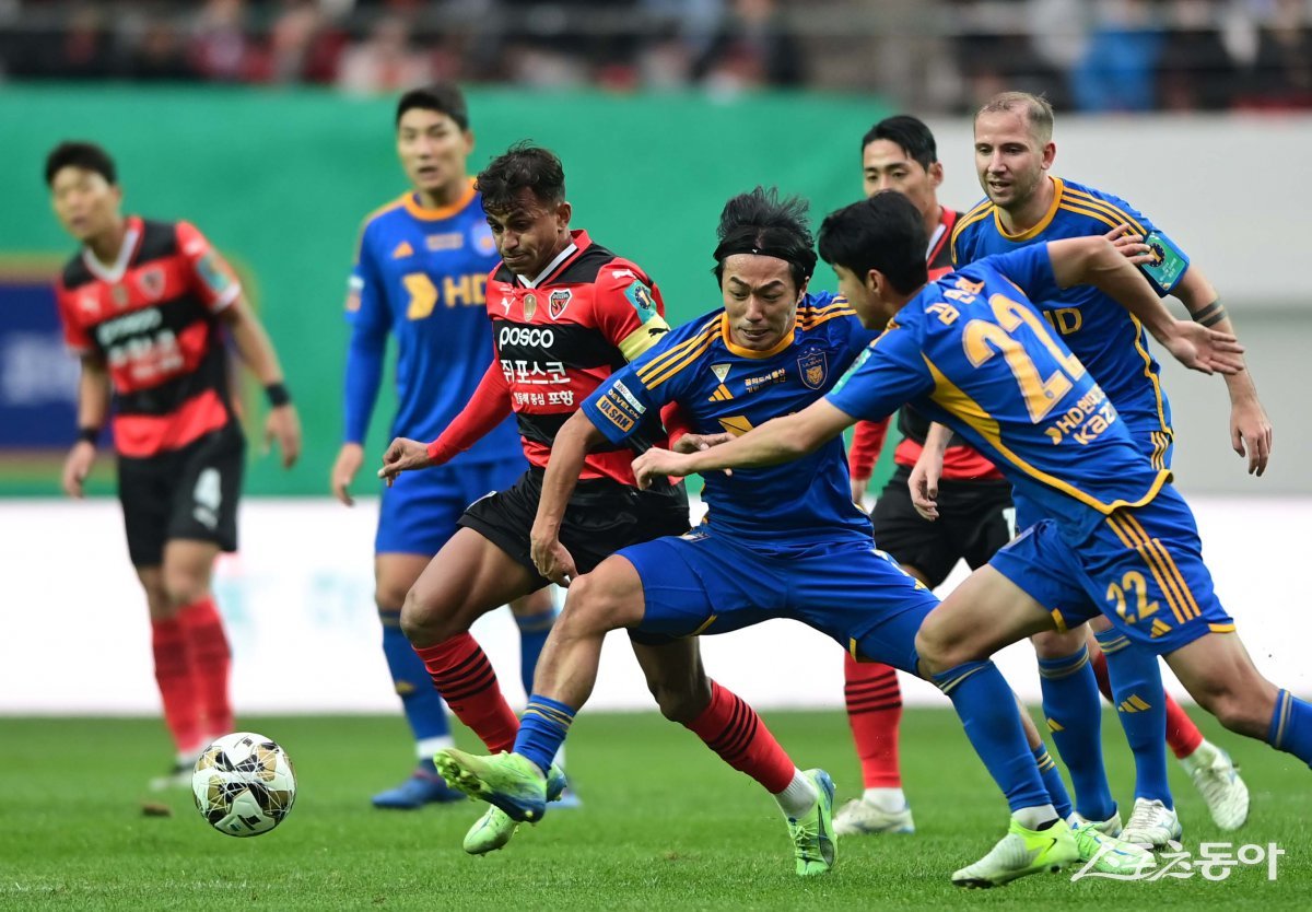 30일 서울월드컵경기장에서 열린 ‘2024 하나은행 코리아컵’ 포항 스틸러스와 울산 HD의 결승전에서 포항 완델손과 울산 고승범이 몸싸움을 하고 있다. 상암 | 주현희 기자 teth1147@donga.com