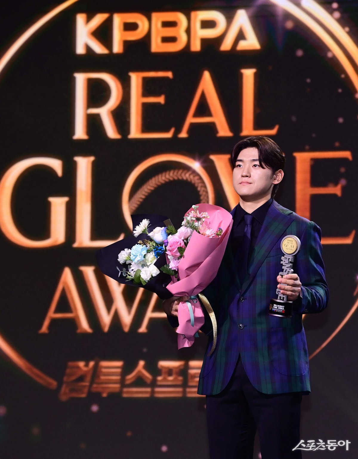 1일 서울 용산구 한남동 그랜드하얏트 서울에서 열린 한국프로야구선수협회 ‘2024 컴투스프로야구 리얼글러브 어워드’에서 팬초이스상을 수상한 KIA 김도영이 기념 촬영을 하고 있다. 주현희 기자 teth1147@donga.com