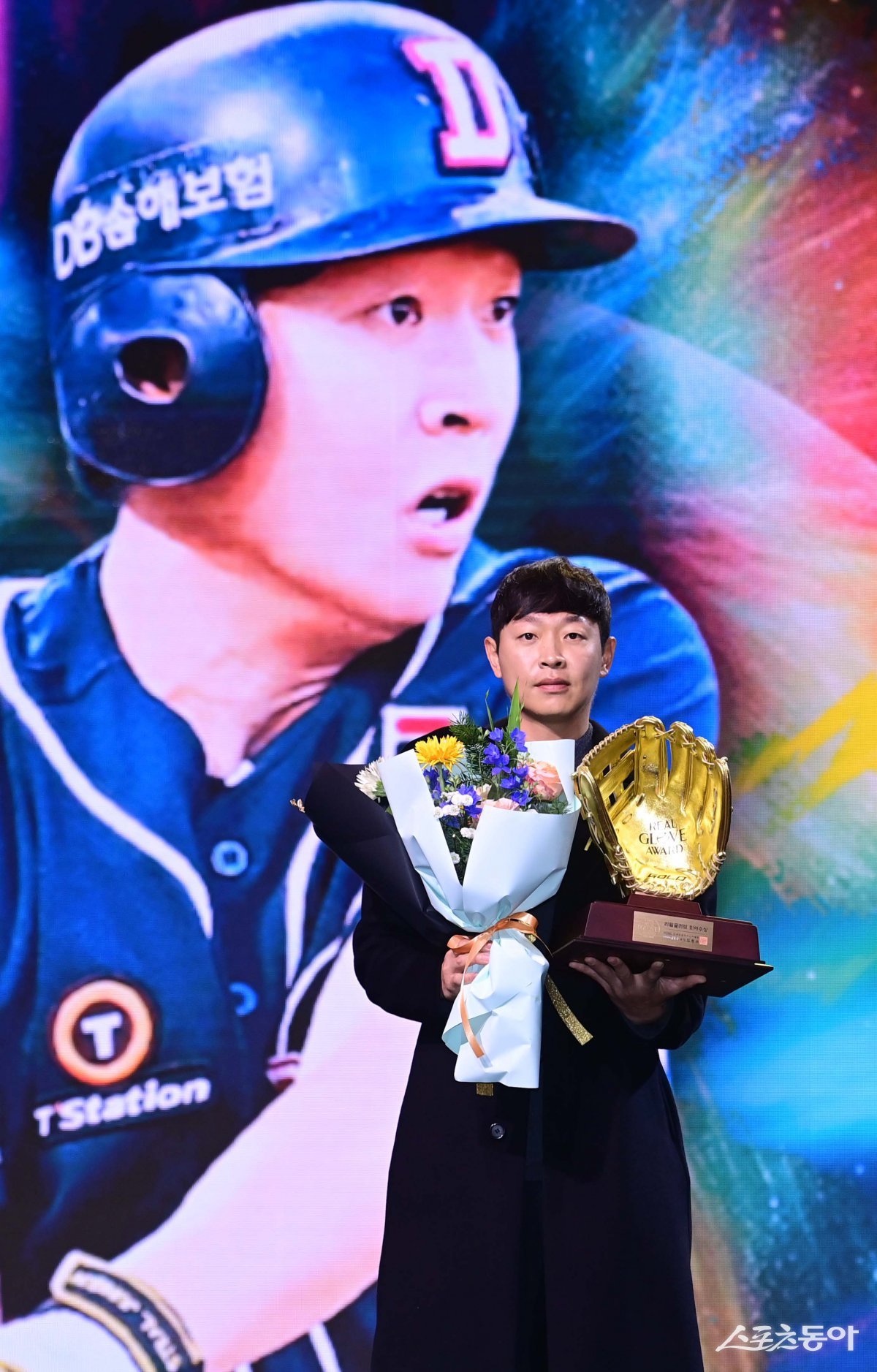 1일 서울 용산구 한남동 그랜드하얏트 서울에서 열린 한국프로야구선수협회 ‘2024 컴투스프로야구 리얼글러브 어워드’에서 리얼글러브상 외야수 부문 두산 정수빈이 기념 촬영을 하고 있다. 주현희 기자 teth1147@donga.com