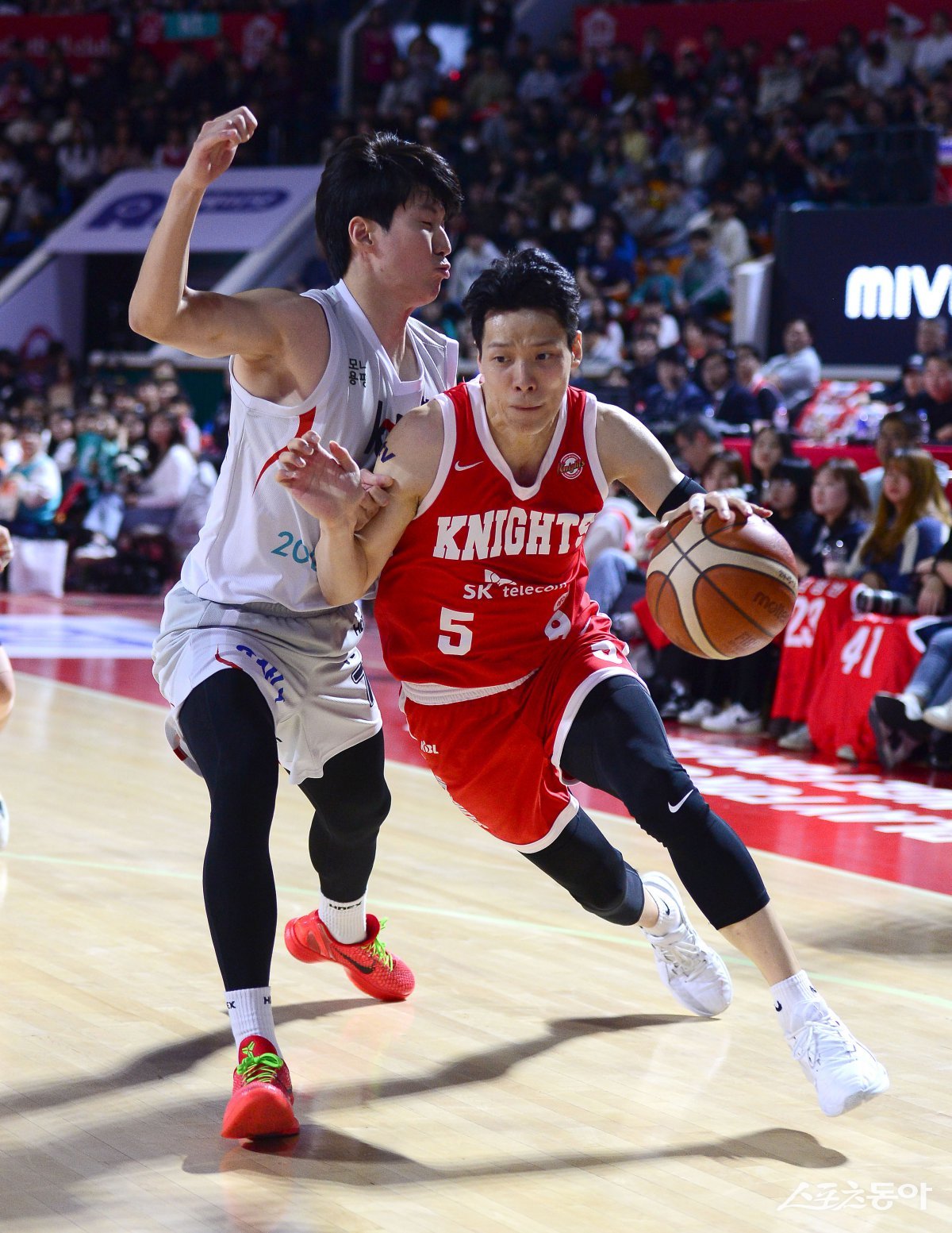1일 서울 잠실학생체육관에서 열린 ‘2024-2025 프로농구’ SK와 KT 경기에서 SK 김선형이 2쿼터 역전 3점슛을 성공시킨 후 기뻐하고 있다. 잠실|김종원 기자 won@donga.com