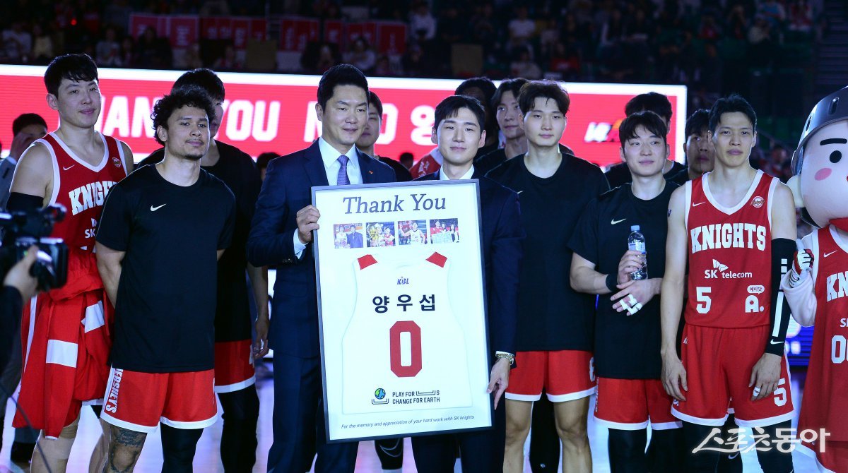1일 서울 잠실학생체육관에서 열린 ‘2024-2025 프로농구’ SK와 KT 경기 하프타임 때 양우섭의 은퇴식이 진행되고 있다. 잠실|김종원 기자 won@donga.com