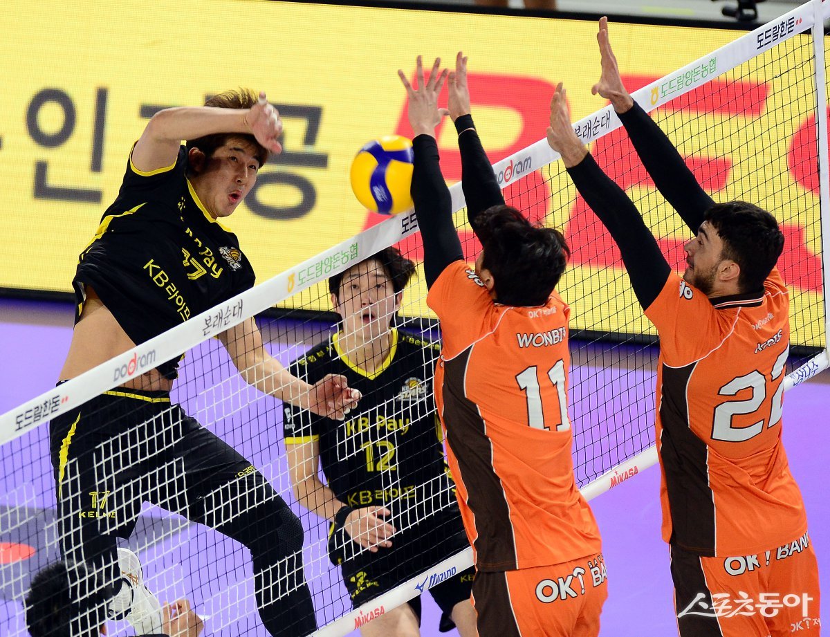 1일 인천 계양체육관에서 ‘도드람 2024-2025 V리그’ 의정부 KB손해보험과 안산 OK저축은행의 남자부 경기가 열렸다. KB손해보험 박상하가 OK저축은행 블로커를 피해 공격을 펼치고 있다. 인천 | 김민성 기자 marineboy@donga.com