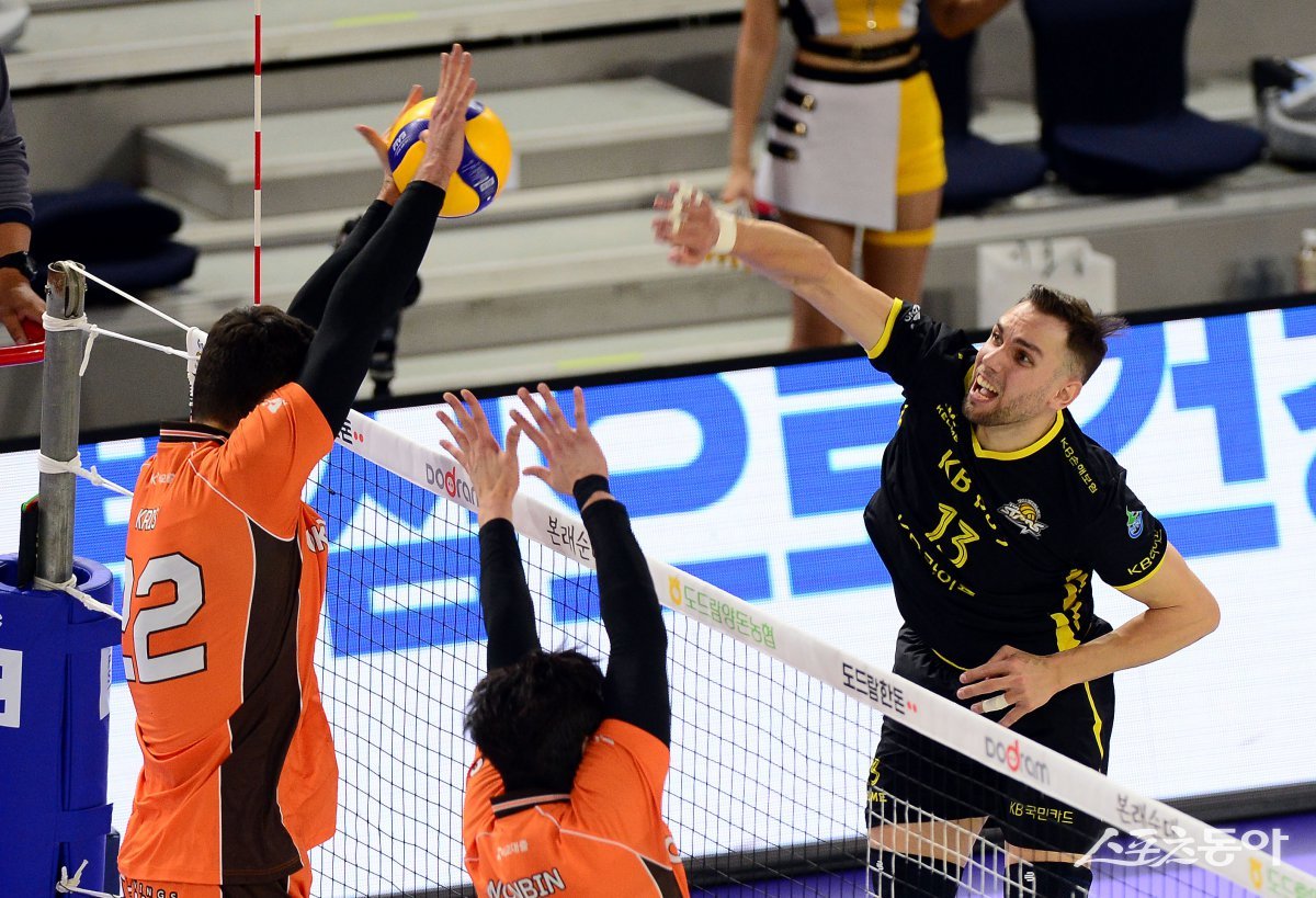 1일 인천 계양체육관에서 ‘도드람 2024-2025 V리그’ 의정부 KB손해보험과 안산 OK저축은행의 남자부 경기가 열렸다. KB손해보험 비예나가 OK저축은행 블로커를 피해 스파이크를 날리고 있다. 인천 | 김민성 기자 marineboy@donga.com