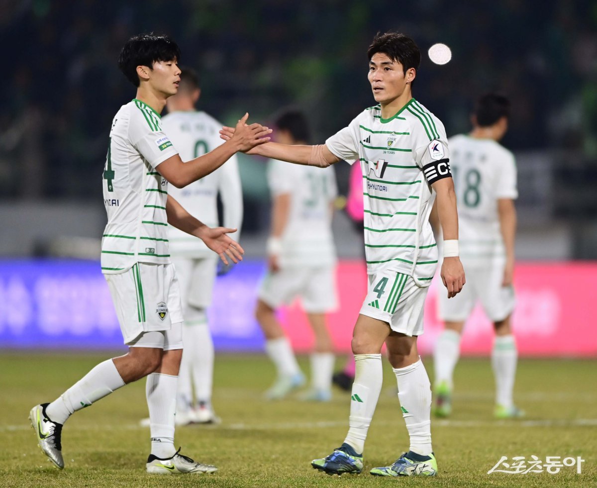 1일 서울 목동종합운동장에서 열린 ‘하나은행 K리그 2024’ 승강 플레이오프 1차전 서울 이랜드와 전북 현대모터스의 경기에서 2-1로 승리한 전북 선수들이 기쁨을 나누고 있다. 목동 | 주현희 기자 teth1147@donga.com