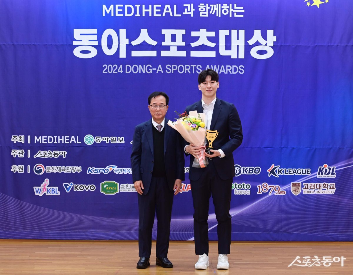 스포츠동아가 동아일보, 채널A와 공동으로 주최하고 국내 5대 프로스포츠(프로야구·프로축구·남녀프로농구·남녀프로배구·남녀프로골프) 종목별로 올 한해를 빛낸 최고의 선수를 선정하는 ‘메디힐과 함께하는 2024 동아스포츠대상‘ 시상식이 2일 서울 성북구 고려대학교 백주년기념관에서 개최됐다. 남자프로농구 올해의 선수상을 수상한 이정현(고양 소노)이 이수광 KBL 총재와 기념촬영을 하고 있다. 주현희 기자 teth1147@donga.com