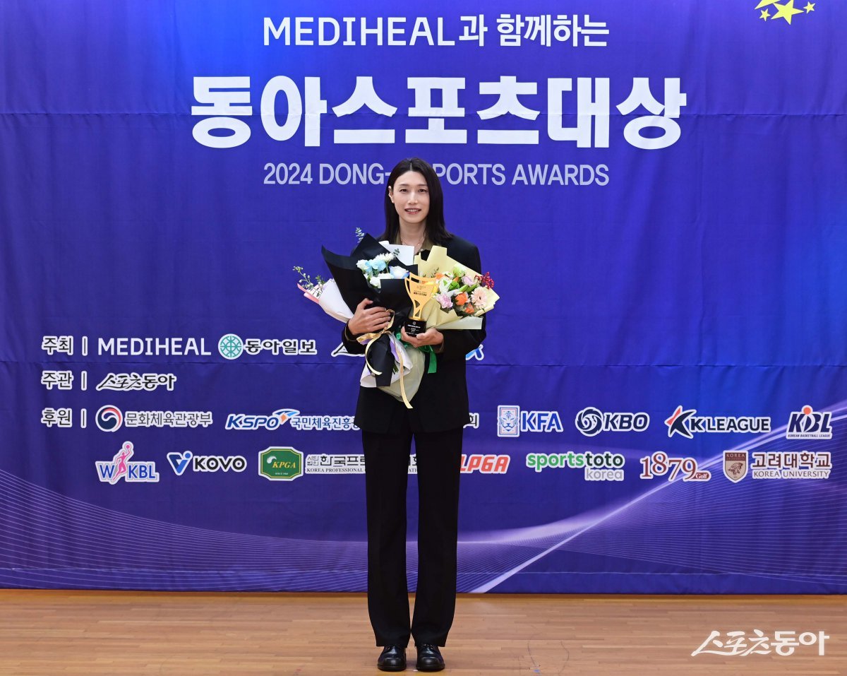스포츠동아가 동아일보, 채널A와 공동으로 주최하고 국내 5대 프로스포츠(프로야구·프로축구·남녀프로농구·남녀프로배구·남녀프로골프) 종목별로 올 한해를 빛낸 최고의 선수를 선정하는 ‘메디힐과 함께하는 2024 동아스포츠대상‘ 시상식이 2일 서울 성북구 고려대학교 백주년기념관에서 개최됐다. 여자프로배구 올해의 선수상을 수상한 김연경(흥국생명)이 기념촬영을 하고 있다. 주현희 기자 teth1147@donga.com
