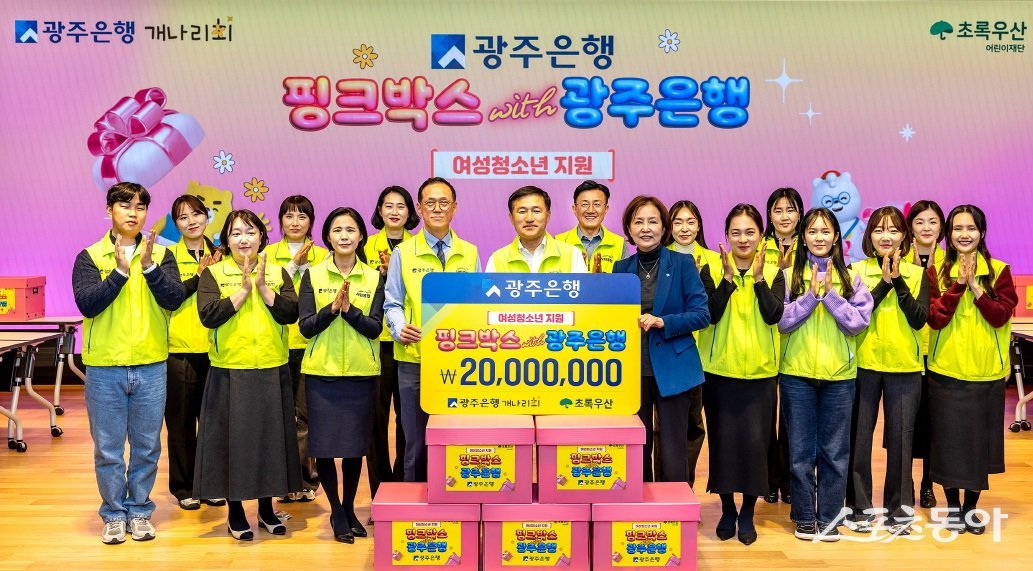 광주은행이 최근 본점에서 고병일 광주은행장과 김은영 초록우산어린이재단 광주지역본부장, 김현희 광주은행 여직원모임 개나리회장 등이 참석한 가운데 지역 취약계층 여성 청소년 100명을 위한 총 2천만 원 상당의 ‘핑크박스’를 전달했다.
