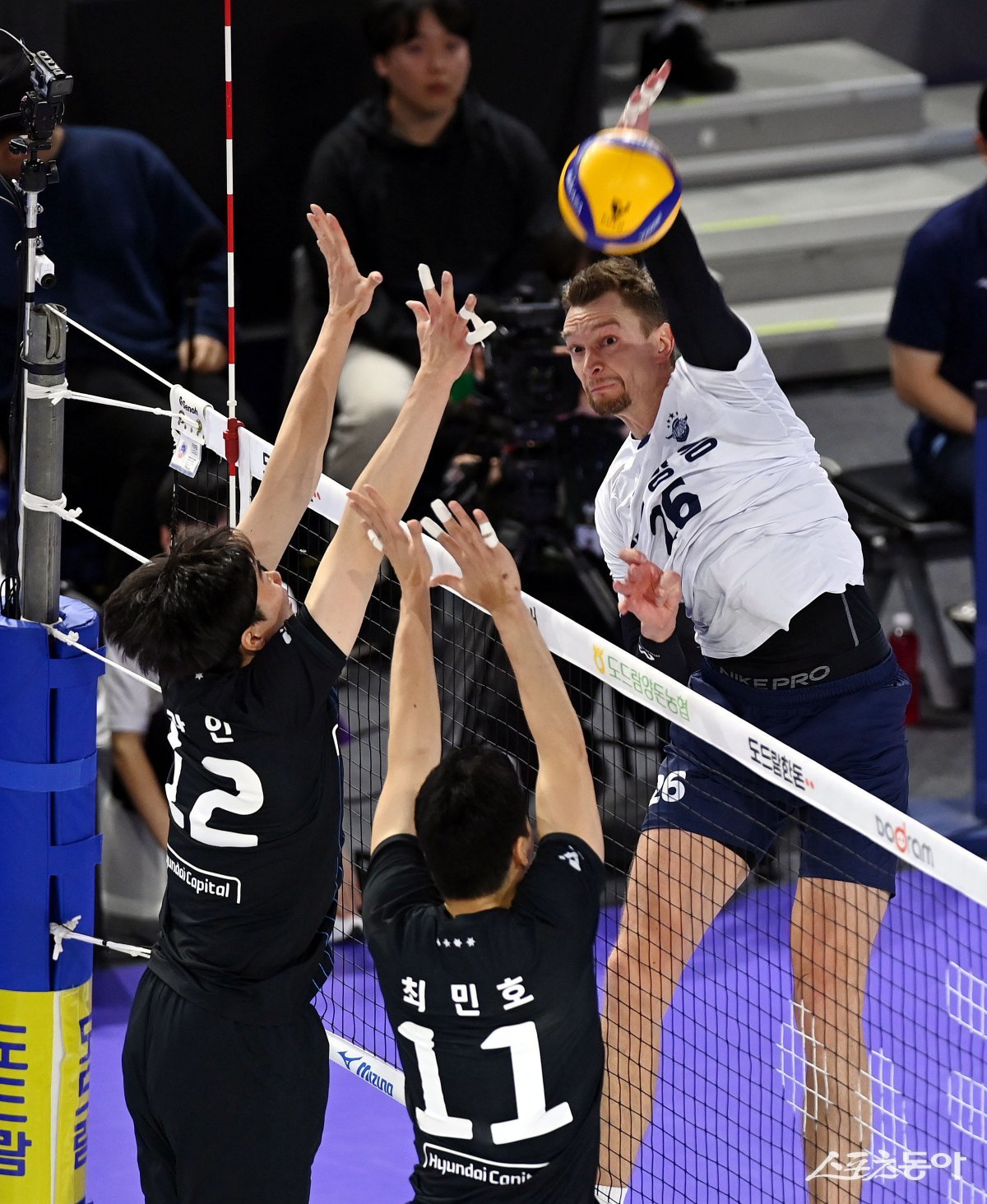 3일 인천 계양체육관에서 ‘도드람 2024-2025 V리그’ 인천 대한항공과 천안 현대캐피탈의 남자부 경기가 열렸다. 대한항공 막심이 현대캐피탈 블로커를 피해 스파이크를 날리고 있다. 인천 | 김민성 기자 marineboy@donga.com