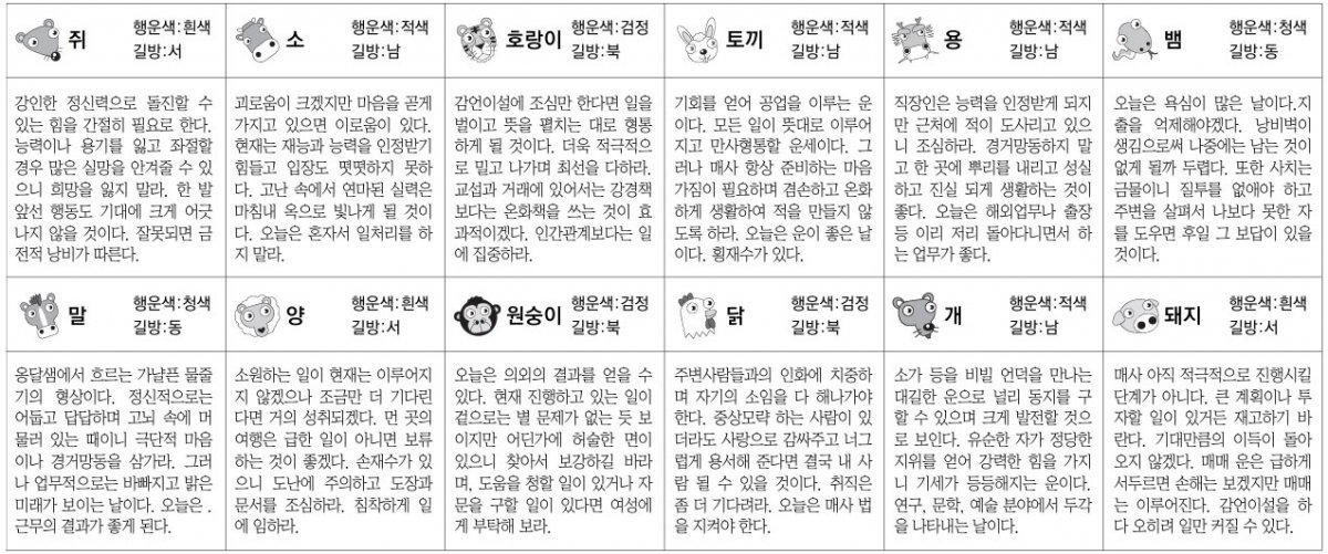 쥐띠 : 강인한정신력으로돌진할수있는힘을간절히필요로한다.능력이나용기를잃고좌절할경우많은실망을안겨줄수있으니희망을잃지말라.한발앞선행동도기대에크게어긋나지않을것이다.잘못되면금전적낭비가따른다.