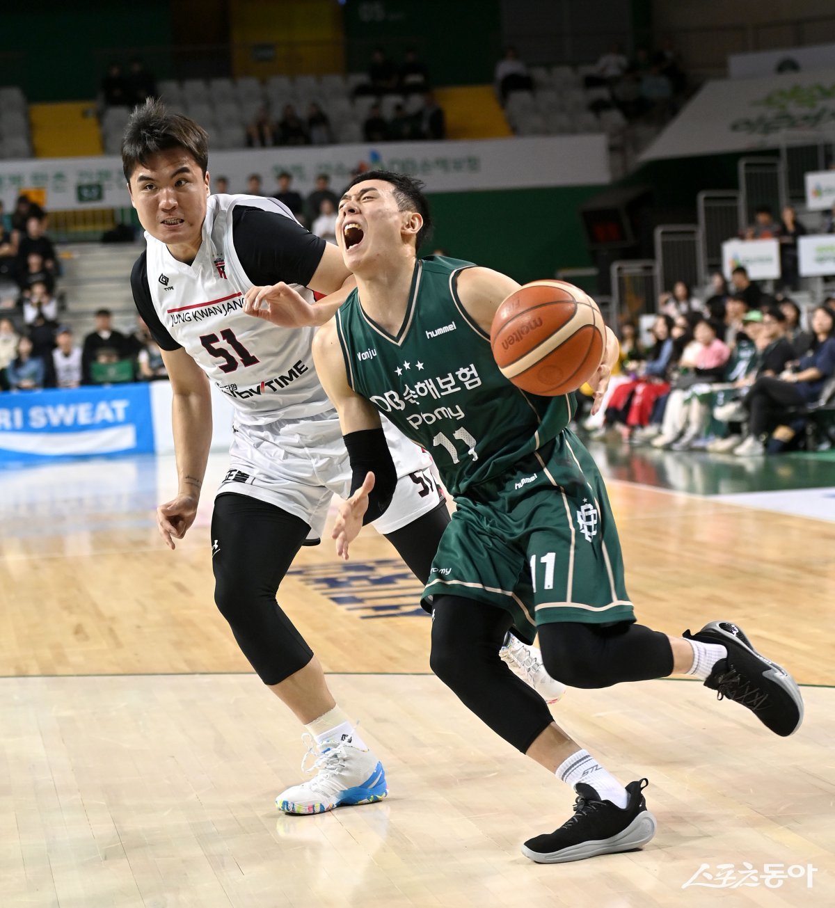 4일 원주종합체육관에서 열린 ‘2024-2025 프로농구’ DB와 정관장 경기에서 DB 이관희가 정관장의 수비를 뚫고 골밑을 공격하고 있다. 원주|김종원 기자 won@donga.com