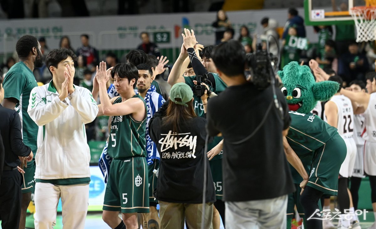 4일 원주종합체육관에서 열린 ‘2024-2025 프로농구’ DB와 정관장 경기에서 98-67 승리를 거두며 4연승을 달린 DB 선수들이 기뻐하고 있다. 원주|김종원 기자 won@donga.com