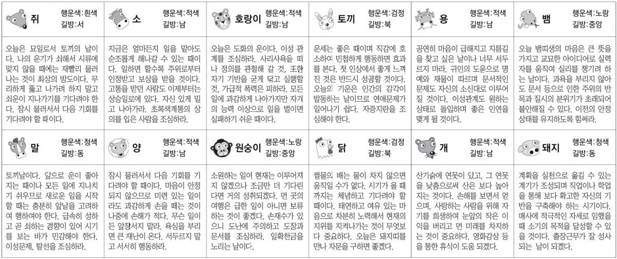 돼지띠 : 계획을실천으로옮길수있는계기가조성되며직업이나학업을통해보다확고한자신의기반을구축해야하는시기이다.매사에적극적인자세로임했을때소기의목적을달성할수있을것이다.출장근무가잘성사되는날이되겠다.