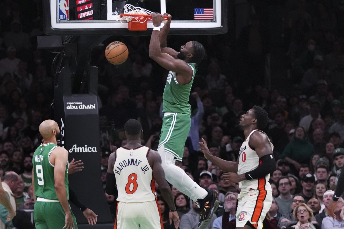 보스턴의 제일런 브라운(오른쪽에서 2번째)이 5일(한국시간) TD센터에서 열린 디트로이트전에서 투 핸드 덩크슛을 터트리고 있다. 보스턴은 디트로이트를 완파하고 동부지구 2위를 지켰다. 보스턴(미 매사추세츠주)|AP뉴시스