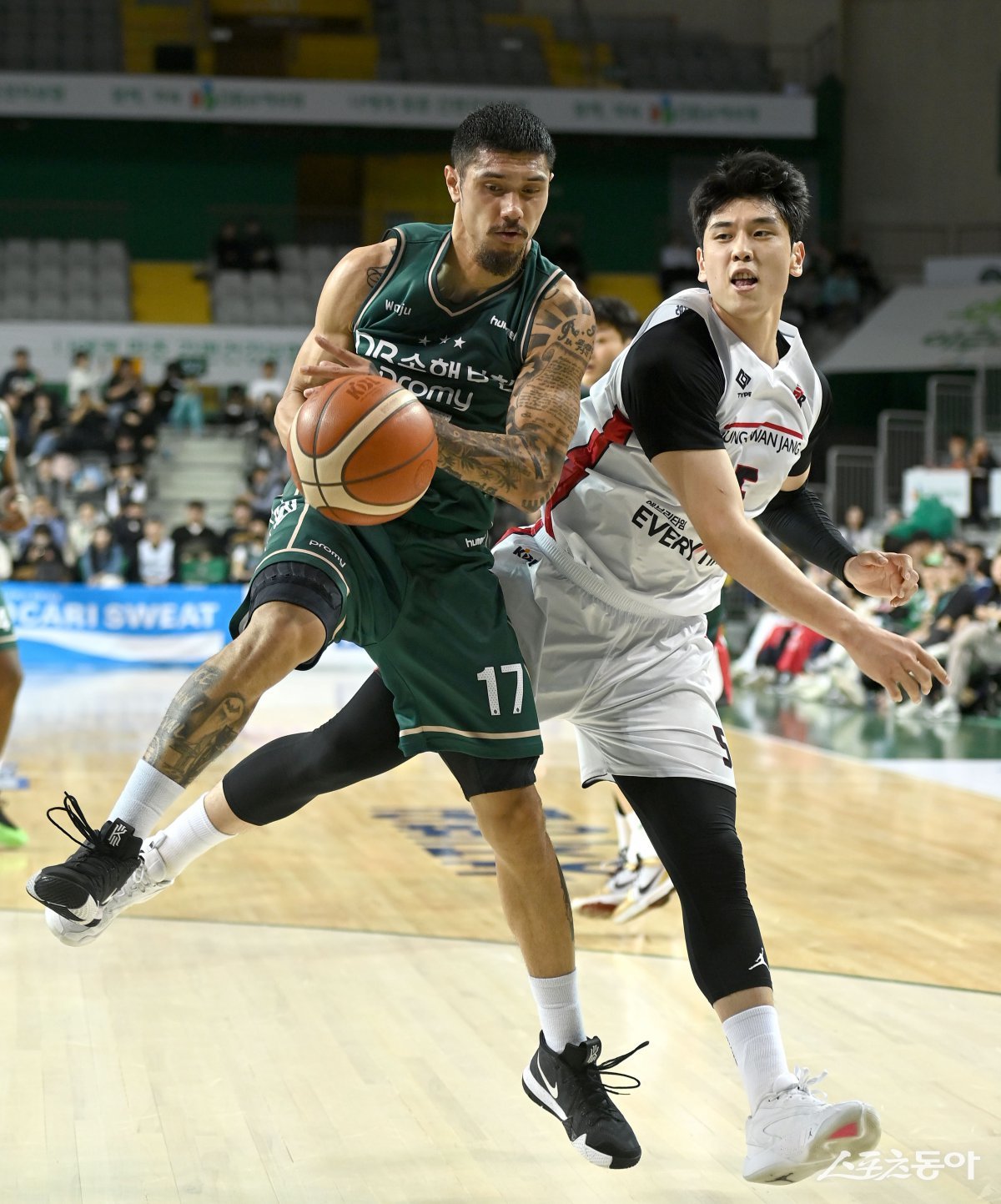 DB 알바노(왼쪽)가 4일 정관장과 홈경기에서 리바운드를 따내고 있다. 원주|김종원 기자 won@donga.com