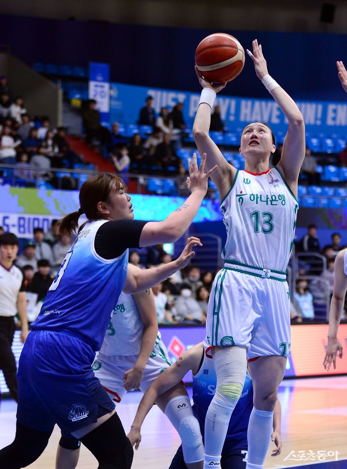 5일 인천 도원체육관에서 열린 ‘하나은행 2024~25 여자프로농구’ 신한은행과 하나은행 경기에서 하나은행 김정은이 신한은행의 수비를 뚫고 골밑 슛을 하고 있다. 인천 | 김종원 기자 won@donga.com