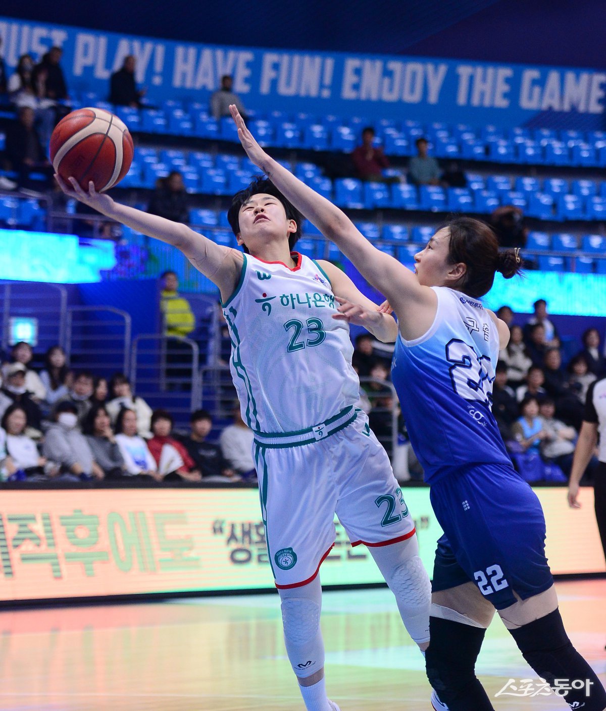 5일 인천 도원체육관에서 열린 ‘하나은행 2024~25 여자프로농구’ 신한은행과 하나은행 경기에서 하나은행 박진영이 신한은행의 수비를 뚫고 골밑 슛을 하고 있다. 인천 | 김종원 기자 won@donga.com