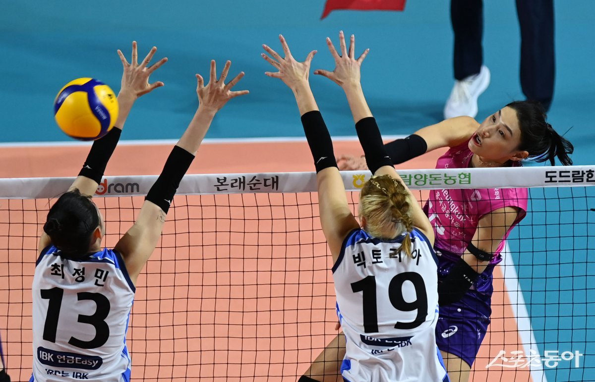 5일 인천 삼산월드체육관에서 ‘도드람 2024-2025 V리그’ 인천 흥국생명과 화성 IBK기업은행의 여자부 경기가 열렸다. 흥국생명 김연경이 IBK기업은행 블로커를 피해 스파이크를 날리고 있다. 인천 | 김민성 기자 marineboy@donga.com