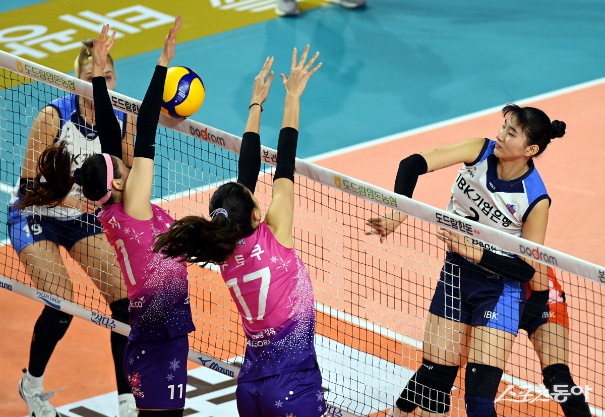 5일 인천 삼산월드체육관에서 ‘도드람 2024-2025 V리그’ 인천 흥국생명과 화성 IBK기업은행의 여자부 경기가 열렸다. IBK기업은행 이주아가 흥국생명 블로커를 피해 공격을 펼치고 있다. 인천 | 김민성 기자 marineboy@donga.com