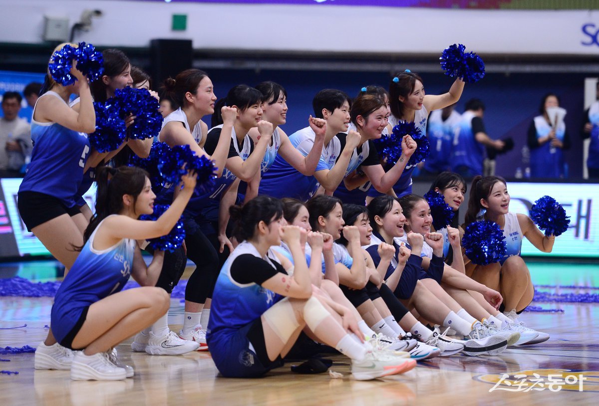 5일 인천 도원체육관에서 열린 ‘하나은행 2024~25 여자프로농구’ 신한은행과 하나은행 경기에서 62-48 승리를 거둔 신한은행 선수들이 기념촬영을 하고 있다. 인천 | 김종원 기자 won@donga.com