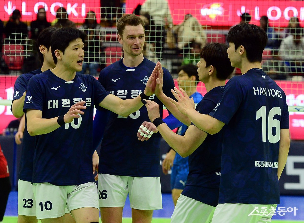 8일 경기도 수원체육관에서 ‘도드람 2024-2025 V리그’ 수원 한국전력과 인천 대한항공의 남자부 경기가 열렸다. 대한항공이 한국전력을 상대로 세트스코어 3-0 승리 후 선수들이 코트에서 기쁨을 나누고 있다. 수원 | 김민성 기자 marineboy@donga.com