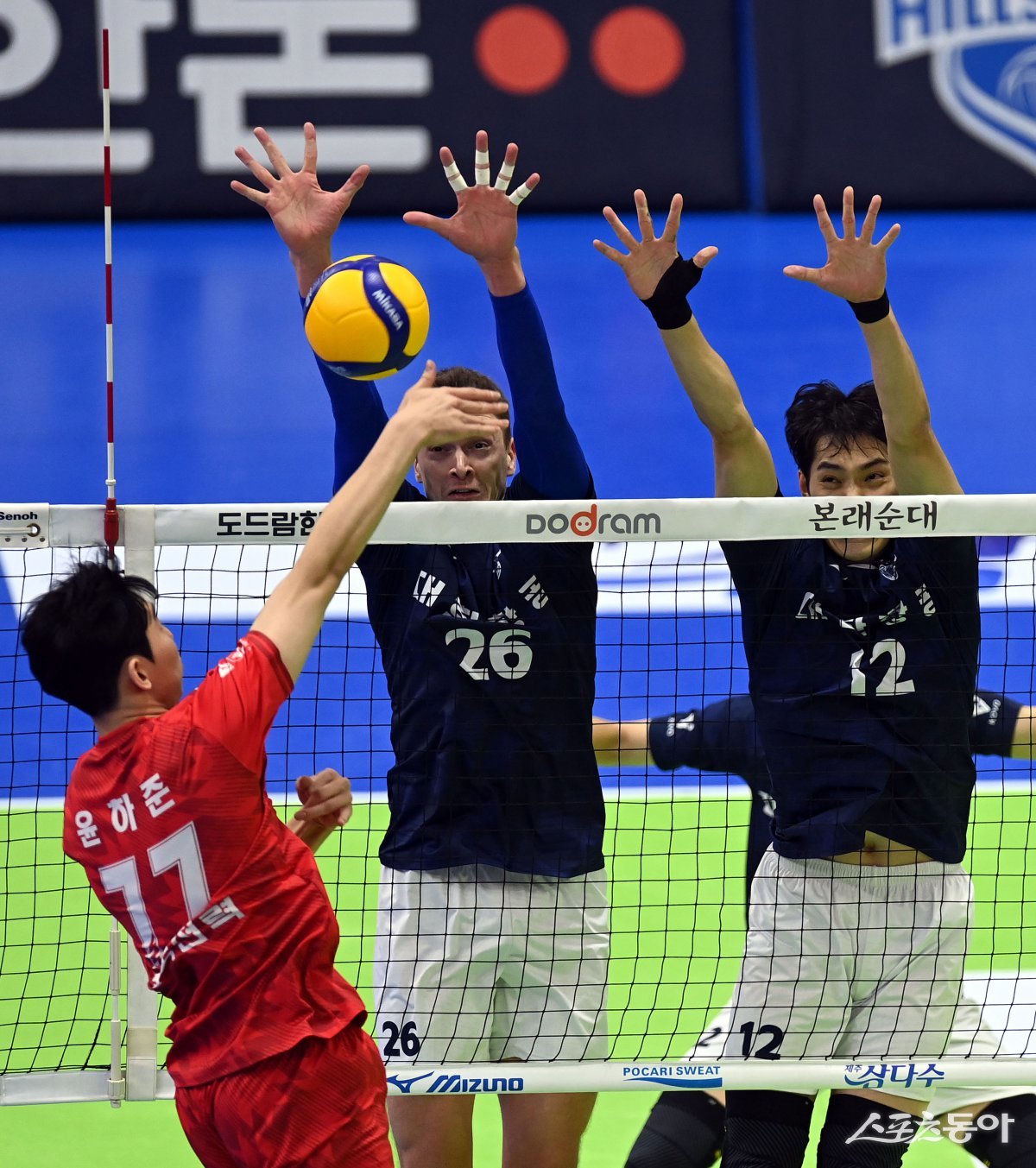 8일 경기도 수원체육관에서 ‘도드람 2024-2025 V리그’ 수원 한국전력과 인천 대한항공의 남자부 경기가 열렸다. 대한항공 막심과 조재영이 한국전력 공격을 블로킹하고 있다. 수원 | 김민성 기자 marineboy@donga.com