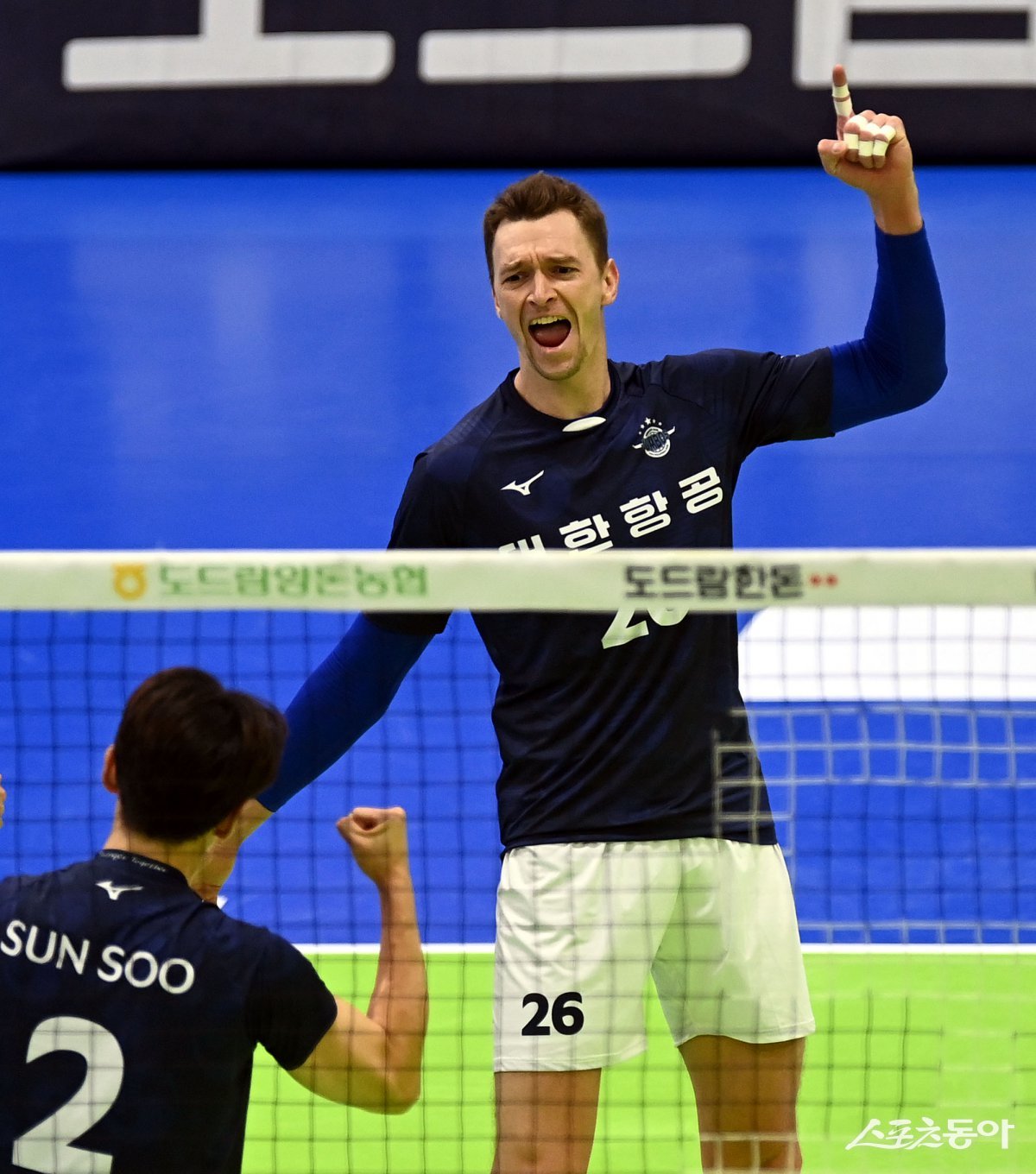 8일 경기도 수원체육관에서 ‘도드람 2024-2025 V리그’ 수원 한국전력과 인천 대한항공의 남자부 경기가 열렸다. 대한항공 막심이 득점 후 환호하고 있다. 수원 | 김민성 기자 marineboy@donga.com