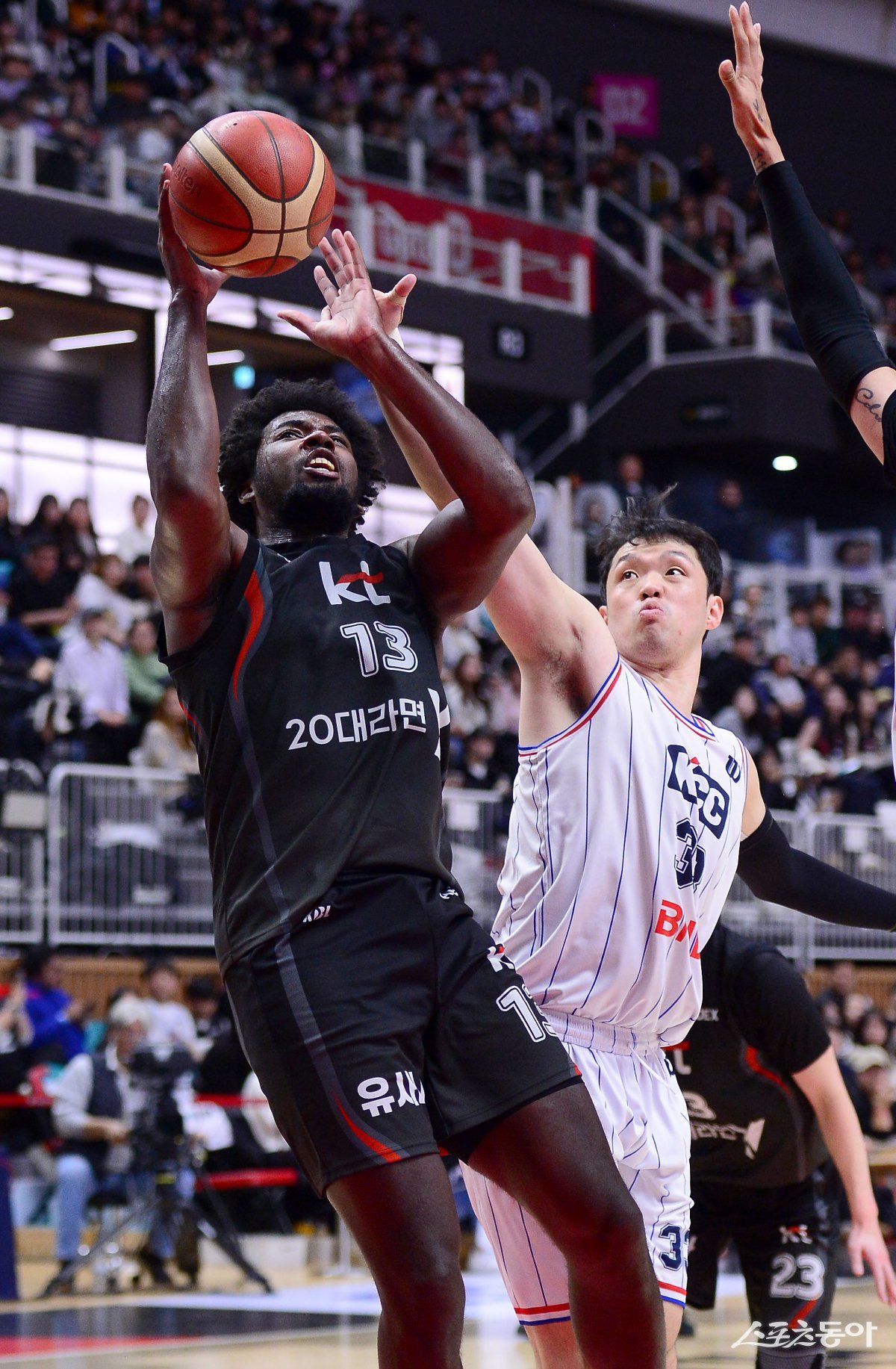 8일 수원 KT 아레나에서 열린 ‘2024-20245 프로농구’ KT와 KCC 경기에서 KT 해먼즈가 KCC의 수비를 뚫고 골밑 슛울 하고 있다. 수원 | 김종원 기자 won@donga.com